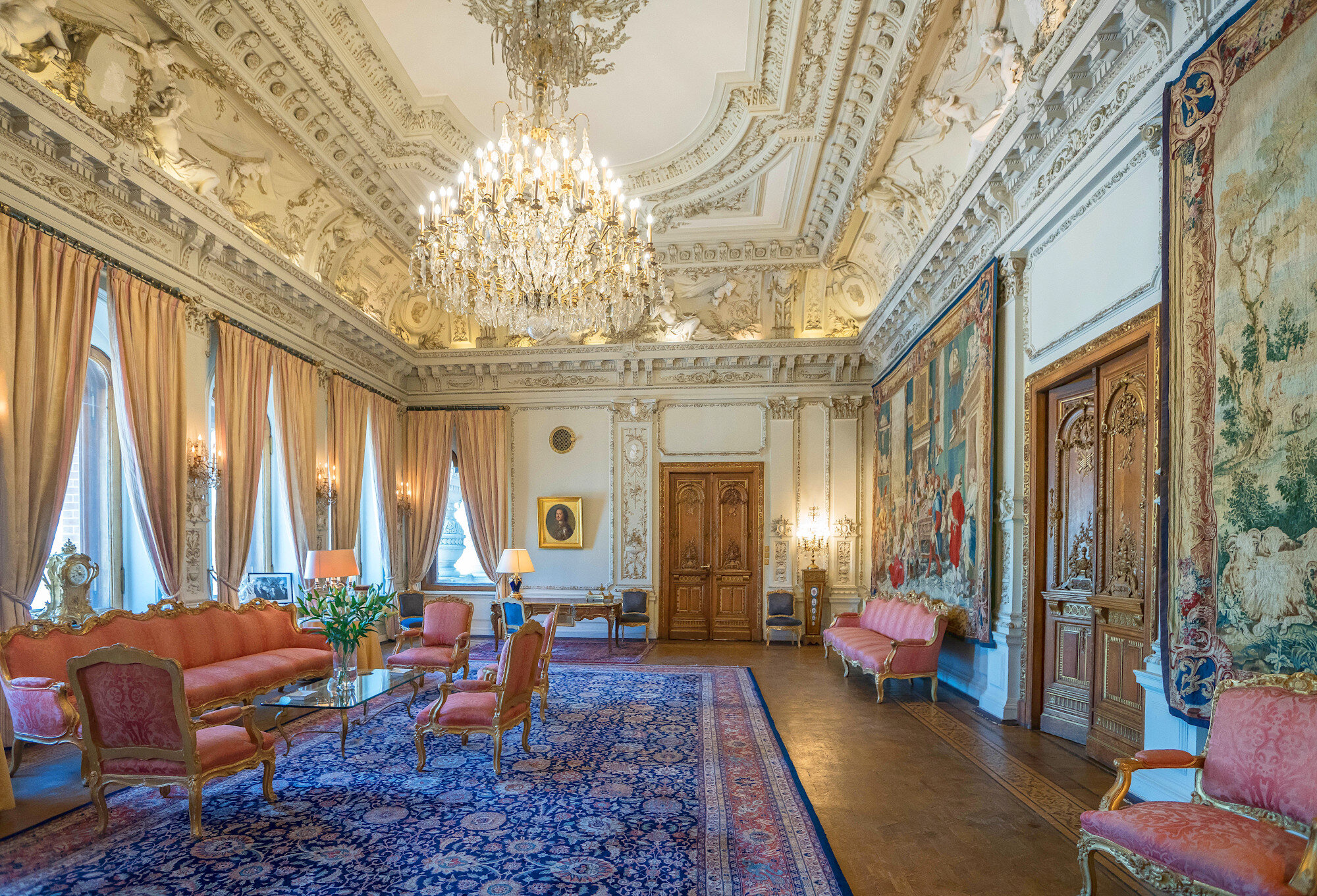 Le mélange des différents styles se fait d’autant plus ressentir si l’on compare l’intérieur du bâtiment avec son extérieur. Les quarante pièces du manoir sont en effet décorées de tapisseries flamandes représentant des scènes allégoriques, et on peut aussi y croiser des meubles datant des XVIIe et XVIIIe siècles. Les murs de l’entrée sont ornés de peintures multicolores, et ouvrent sur un couloir qui mène à un grand salon, décoré dans le style Louis XV. Les chambres du premier étage semblent, quant à elles, inspirées du style Art nouveau qui connaît son essor en Europe.